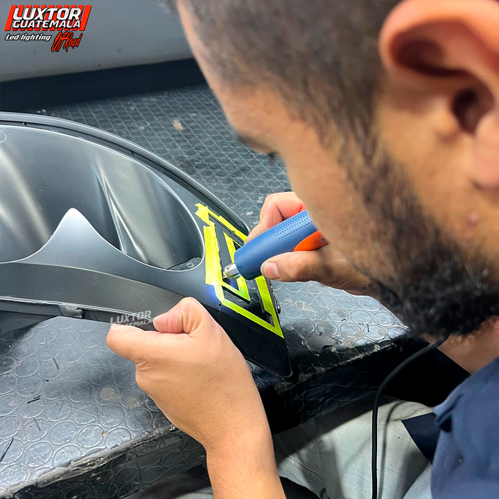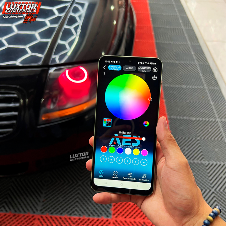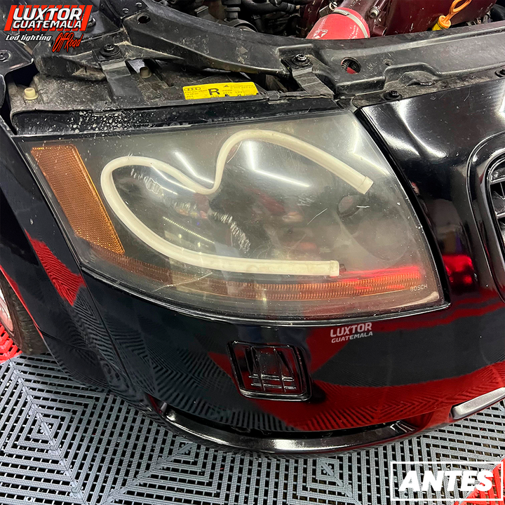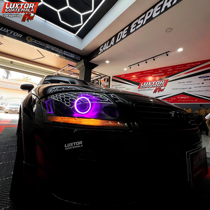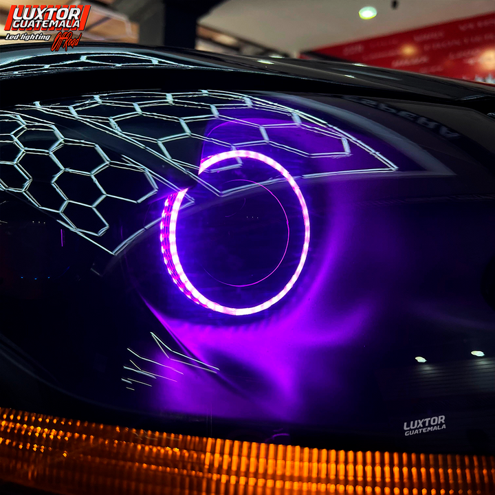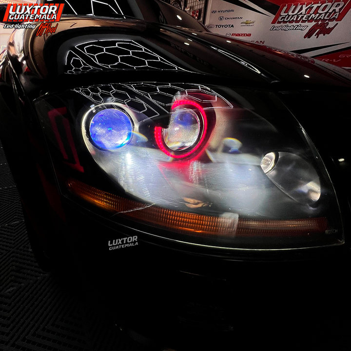 Par de proyectores AES tri-color, un par de aureolas RGB controladas por App, tratamiento químico en pantallas, Blackhousing, reparación interna de silvines, Diseño personalizado TT en luz media, mejoramos la apariencia e iluminación quedando nuestro cliente mas que satisfecho con el trabajo.