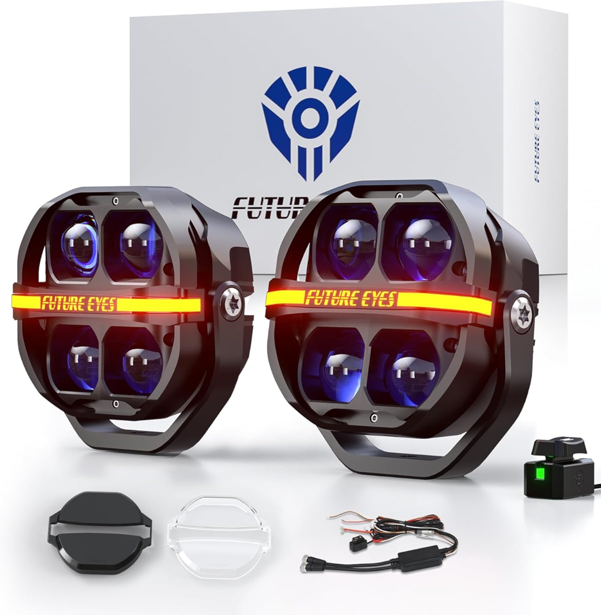 Las cuatro lupas incorporan blue glass, un vidrio tintado azulado que añade un efecto estético distintivo, y puede ayudar a filtrar ciertas longitudes de onda; esto aporta un tono más tecnológico o personalizado al haz de luz cuando están apagadas o cuando la luz blanca / amarilla se combina con ellas.